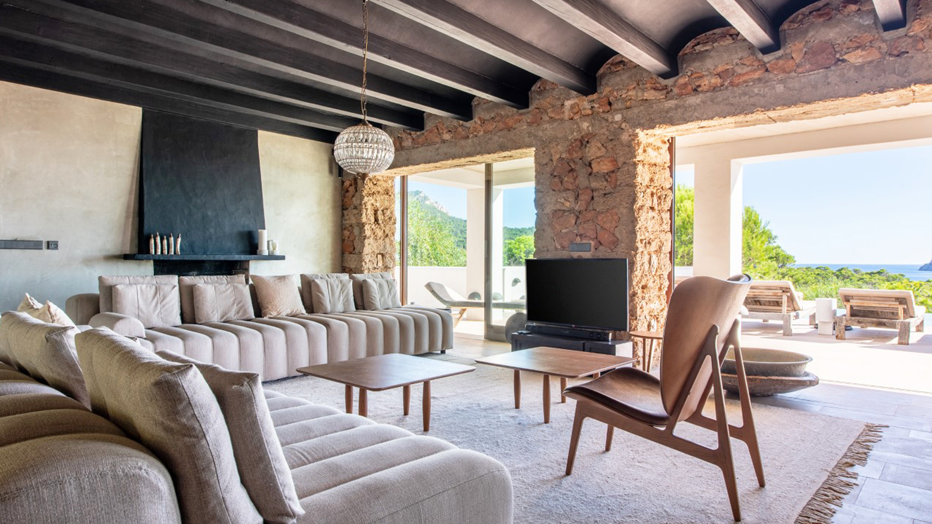 Internally, Licorice highlights a modern style with surprisingly dark tones, an unusual detail for a seaside summer residence. All furnishings and materials tend towards black and dark brown, perfectly complementing the choice of some walls in natural stone and some deliberately left raw details. It's evident the taste and refinement in creating this very particular and intriguing environment. Of course, guests have access to all the latest technological amenities, both in common areas and in the evenly distributed bedrooms between the main house and the guest house with access to the internal courtyard.